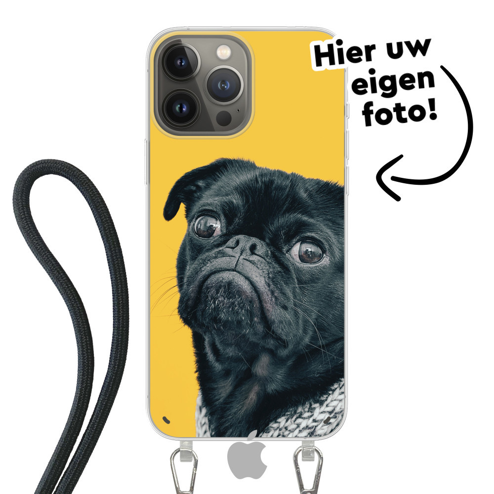 Ontdek het ultieme iPhone 13 Pro Max hoesje! Beschermend, flexibel soft case iPhone hoesje met een kabel om rond uw lichaam te dragen. Uw ontwerp in levendige kleuren met UV-print.